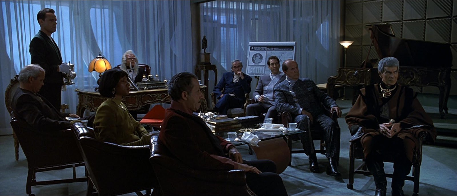 he still on the Enterprise? It might be voluntary, as the man just refuses to leave Kirk's side. Well, we're wasting time with these unanswerable questions. Lets get back to Sulu and the Excelsior. He's enjoying a cup of coffee when there's suddenly a huge explosion. The Klingon moon Praxis has exploded, sending faster-than-the-speed-of-light shock waves throughout this particular section of the galaxy. Excelsior Communications Officer Janice Rand (another promotion, but this one far more understandable--that woman's been ignored far too long) radios the appropriate Klingon with an offer of assistance, and is rebuffed. The Klingons can handle this little problem themselves, thank you very much. Except it turns out they can't. As is revealed at a Starfleet Command meeting in San Francisco, the exploding moon, the site of a key, and apparently very combustible, Klingon energy production facility, has, among other things, knocked out the homeworld's ozone layer. The Klingons have only fifty years left, unless they spend a lot of money fixing the problem, money currently being spent on their military. To that end, they want to hold peace negotiations with the Federation. Technically, they're