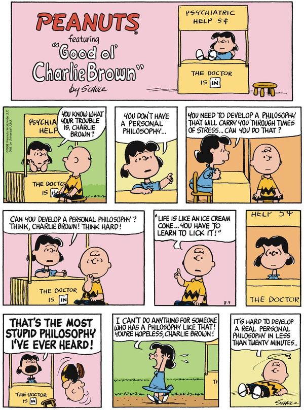Here's a collection of Peanuts strips. I've tried to make them as large as I can, but, if you really want to avoid eye strain, it's best to click to enlarge.